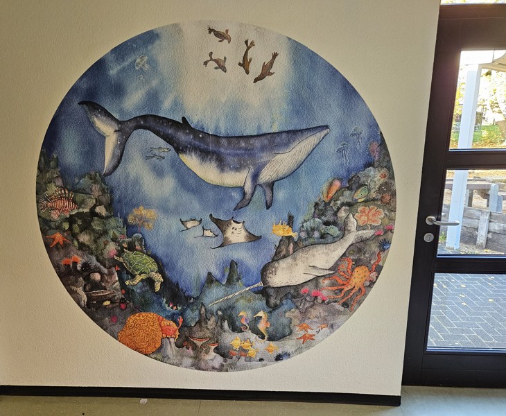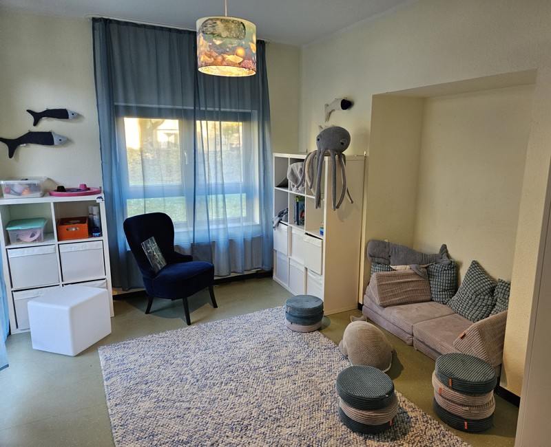 Der sogenannte Blaue Salon macht nun seinem Namen alle Ehre: Der Förderverein hat ihn mit Sofa, Lesesessel, Sitzkissen, Lampe, Teppich, Vorhängen und Regalen komplett neu eingerichtet. Eine Wand ziert nun auch ein großer Tapetenkreis mit Unter-Wasser-Motiv, und Meerestiere zum Kuscheln durften auch nicht fehlen.